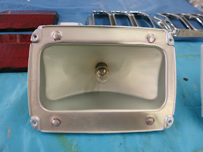 The rear license light assembly was disassembled and restored. The key is finding a unit with nice, original wiring. You will also note that the assembly is dated. This is the original from the car and is dated "5F" for June of 1965.